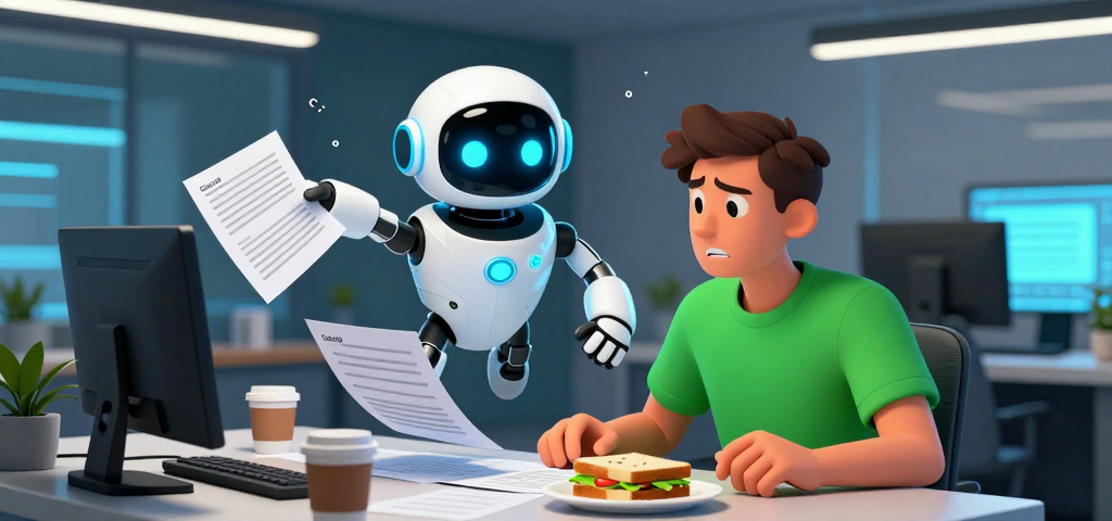 “image_prompt”: “Un’illustrazione satirica in stile cartoon che rappresenta Claude Cowork come un impiegato robot con un sorriso falso che ruba documenti da una scrivania. Lo sfondo è un ufficio futuristico con schermi pieni di codice e file volanti. I colori sono vivaci ma con un tono ironico, con accenti di rosso per rappresentare il pericolo. Lo stile ricorda i fumetti di fantascienza anni ’80, con linee nette e un tocco vintage.”