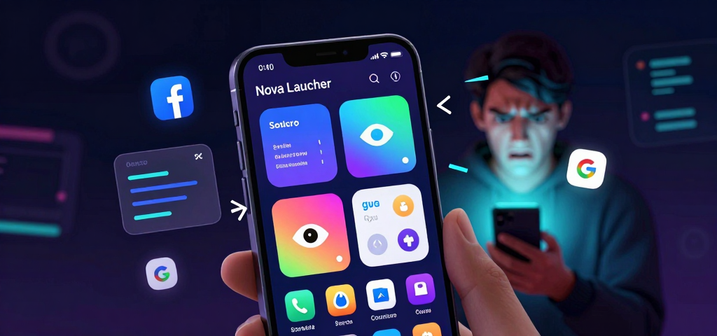 “image_prompt”: “Un’illusione ottica che rappresenti Nova Launcher con gli occhi da tracker, mentre uno smartphone Android cerca di fuggire. Lo stile è cyberpunk anni ’80, con colori neon e sfondi digitali pixelati. Sullo sfondo, ombre di icone Android che si trasformano in banner pubblicitari.”