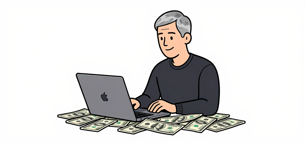E poi c’è la questione della ironia. Guardate l’immagine qui sotto: Tim Cook che sorride mentre è seduto su un mucchio di soldi, con un MacBook aperto davanti. È un’immagine che dice tutto: Apple si arricchisce mentre i creatori devono stringere la cinghia.